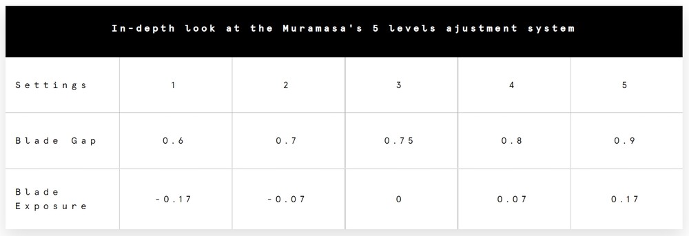 Muramasa 안전면도기는 독자적으로 개발한 조절형 슬라이딩 베이스 플래이트 시스템이 적용되어 면도날을 견고하게 지지하면서 면도날의 노출정도와 간격을 빠르게 조절할 수 있다. 다이얼을 돌리면 베이스 플래이트들을 함께 헤드로부터 움직이게 하면서 면도날과 피부의 접촉점에 변화를 가져오게 된다. 이것은 면도날의 노출정도와 가격의 차이를 동시에 가져오는 것을 의미한다.