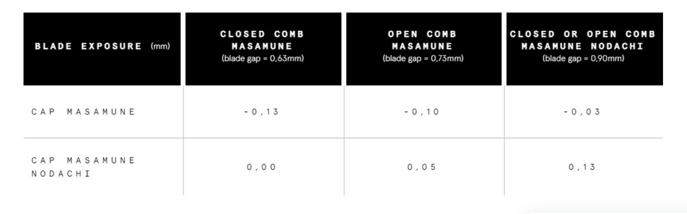 Masamune면도기와 Masamune Nodachi면도기의 캡과 플레이트는 서로 교체하여 사용이 가능하며 그에 따른 면도날 노출도와 갭의 차이에 따른 면도성격 변화를 즐기실 수 있습니다. 아래 도표 참조하세요.