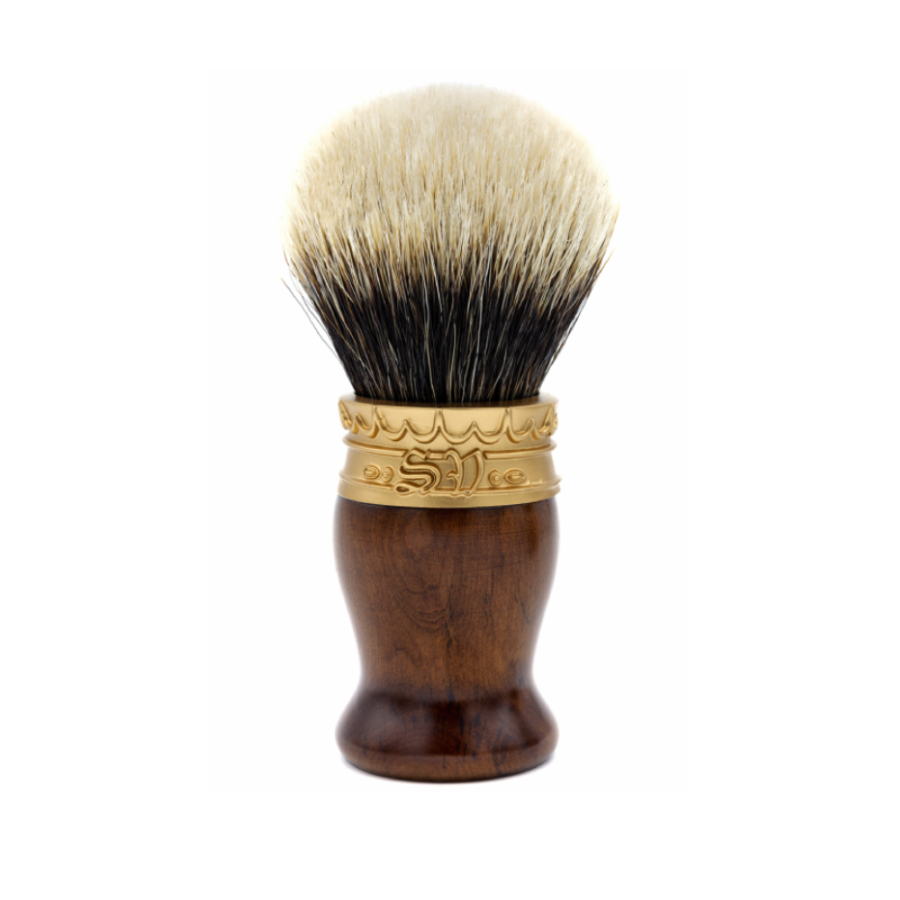 Artisanal shaving brush, featured by a two-bands High Mountain White Badger knot, from Manchuria. Knot size: 26mm – Loft: 50mm. The handle is the result of 3 different italian artisans’ work. The crown ring is realized through pure pewter fusion.